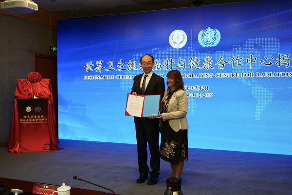 2019年10月12日,世界卫生组织(WHO)辐射与健康合作中心揭牌仪式在中国疾病预防控制中心辐射防护与核安全医学所(以下简称“辐射安全所”)举行,这是WHO在我国放射卫生领域的第一个合作中心。WHO驻华代表处Fabio Scano博士,WHO公共卫生、环境和健康社会决定因素部辐射处技术官员María del Rosario PEREZ博士,国家卫生健康委职业健康司吴宗之司长、卫生应急办公室李正懋副主任、疾病预防控制局周宇辉副局长、综合监督局秦兴强副局长、法规司陈宁姗副司长、食品安全标准与监测评估司李泰然副巡视员、国际合作司李娟副处长等领导,中国疾控中心主任高福院士和有关处室负责人莅临会议。辐射安全所孙全富所长、曹进华书记、刘青杰副所长、吕珂纪委书记、职工代表以及特邀专家等共120余人参加了会议。仪式由刘青杰副所长主持。